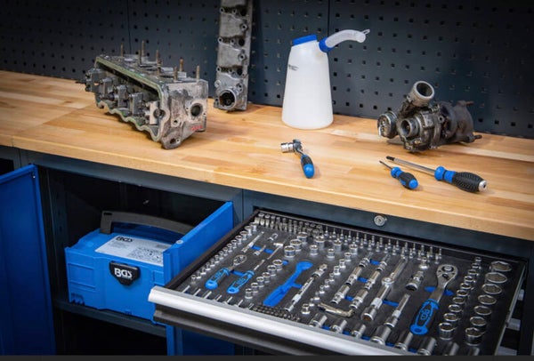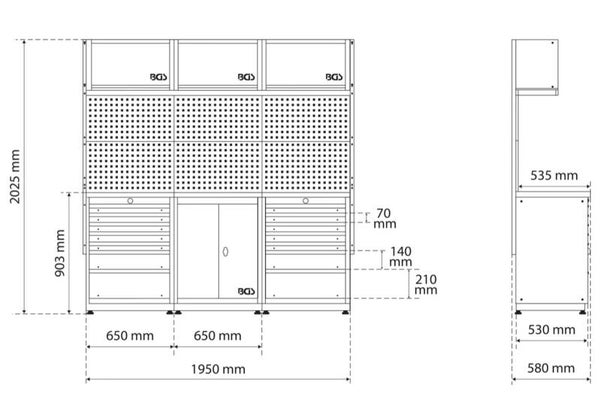 - met geperforeerde wandelementen voor individuele en overzichtelijke opslag van gereedschap