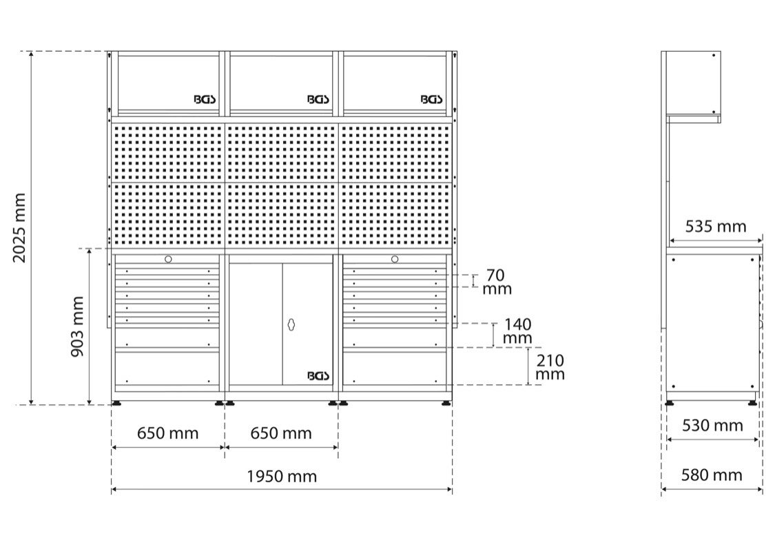 Bruto gewicht245 kgOppervlakteveredelingGepoedercoatHoogte van de lade10 x 70 | 2 x 140 | 2 x 210 mmDiepte van de lade420 mmAantal laden14 stuksLengte van de lade590 mmUitschuiflade100 %