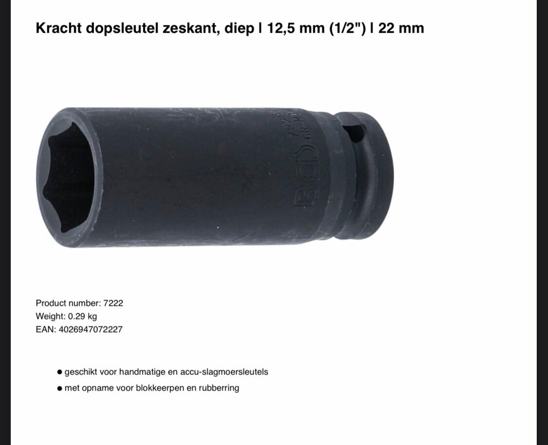 Kracht dopsleutel zeskant, diep | 12,5 mm (1/2") | 22 mm