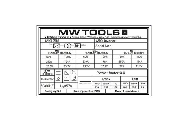 MIG industriële synergie lasinverter LCD 250A + accessoires MW Tools