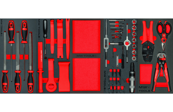 De tweekleurige rode en zwarte FOAM tray modules van MW TOOLS-schuimbakjes maken het mogelijk om uw gereedschap netjes te organiseren en op te bergen in uw gereedschapswagen.