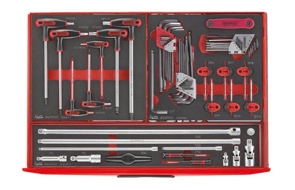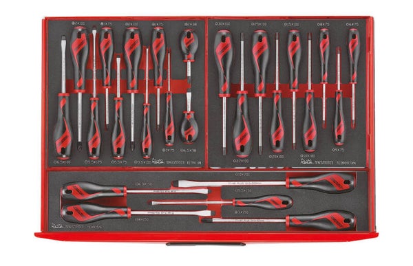 Deze set combineert een gereedschapswagen met 7 lades met het "foam trays" opbergsysteem. De foam trays houden het gereedschap goed op zijn plaats. De contrasterende rode en zwarte kleuren maken het mogelijk om ontbrekend gereedschap onmiddellijk te identificeren.