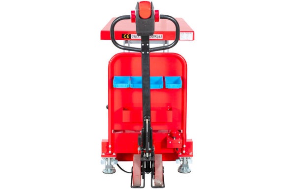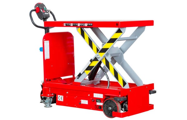 Zelfrijdende elektrische heftafel 500 kg met hefhoogte 1000 mm en tafel van 1020 x 610 mm.