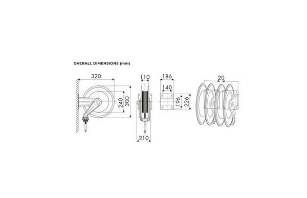 Haspel perslucht en water 15 m Ø G 3/8" (f) 20 bar Gepoederlakt staal met automatische oprol en vaste muurbeugel Raasm