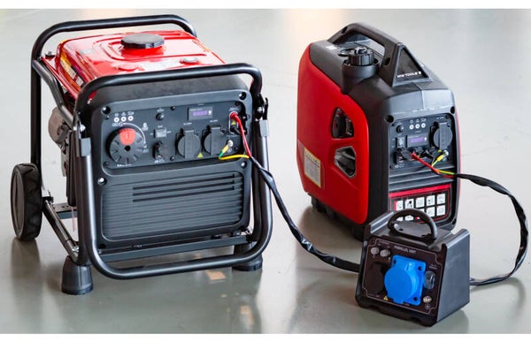 - Parallel stekkerdoos voor het koppelen van 2 generatoren. Met 2 stopcontacten 230V (16A en 32A) en maximale belasting van 10 kW (ref. PB3210)