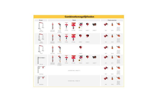 - Balkenklem 2 ton (754751502) en 3 ton (716171903), geschikt voor het ophangen van kettingtakels met haak, of voor het hijsen van H-balken