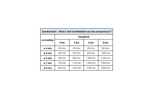 Het minimale luchtdebiet van uw compressor moet 230 liter/min bij 10 bar zijn. Kies de compressor op basis van de nozzle-diameter (ø 4-8 mm) en straaldruk (4-8 bar).