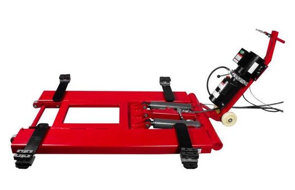 Deze hefbrug en zijn pompgroep staan op transportwielen. De pompgroep kan vastgeklikt worden aan de brug, zodat je deze samen kan verplaatsen of uit de weg rollen.