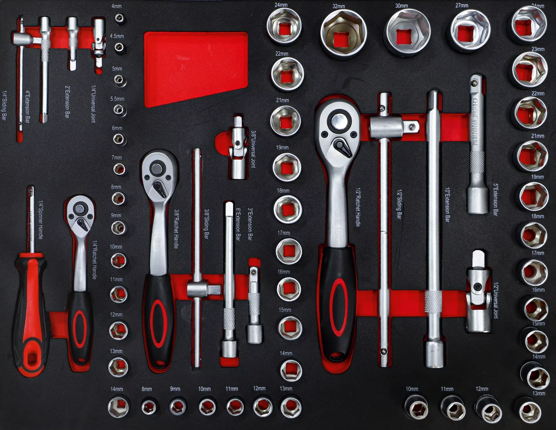 - dopsleutelset, 6,3 mm (1/4"), 10 mm (3/8"), 12,5 mm (1/2"), 61-dlg.